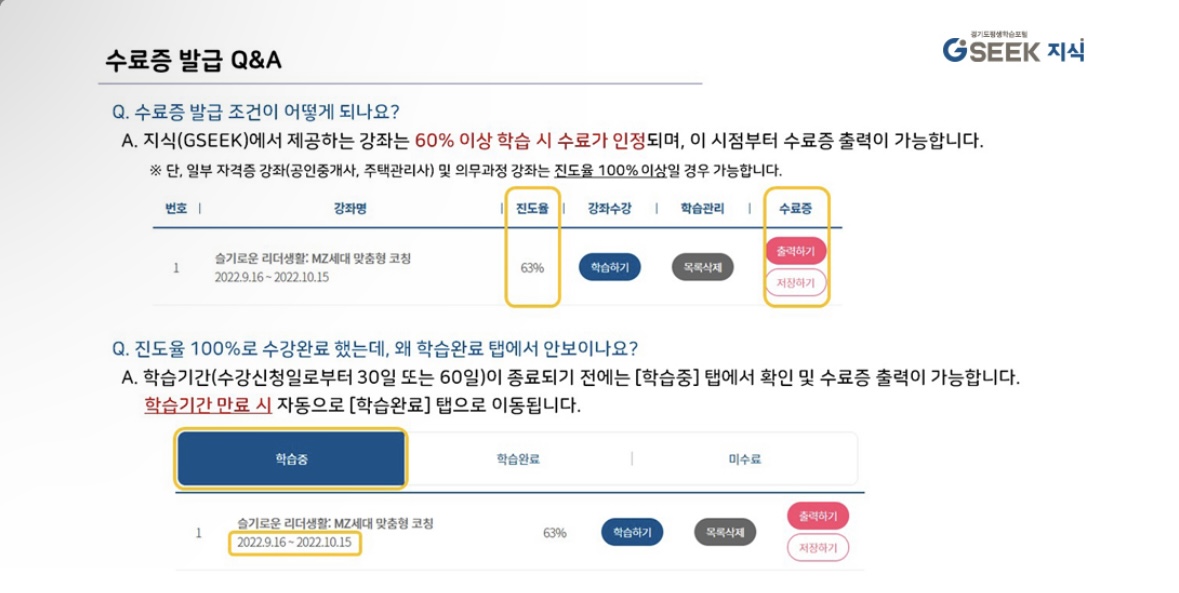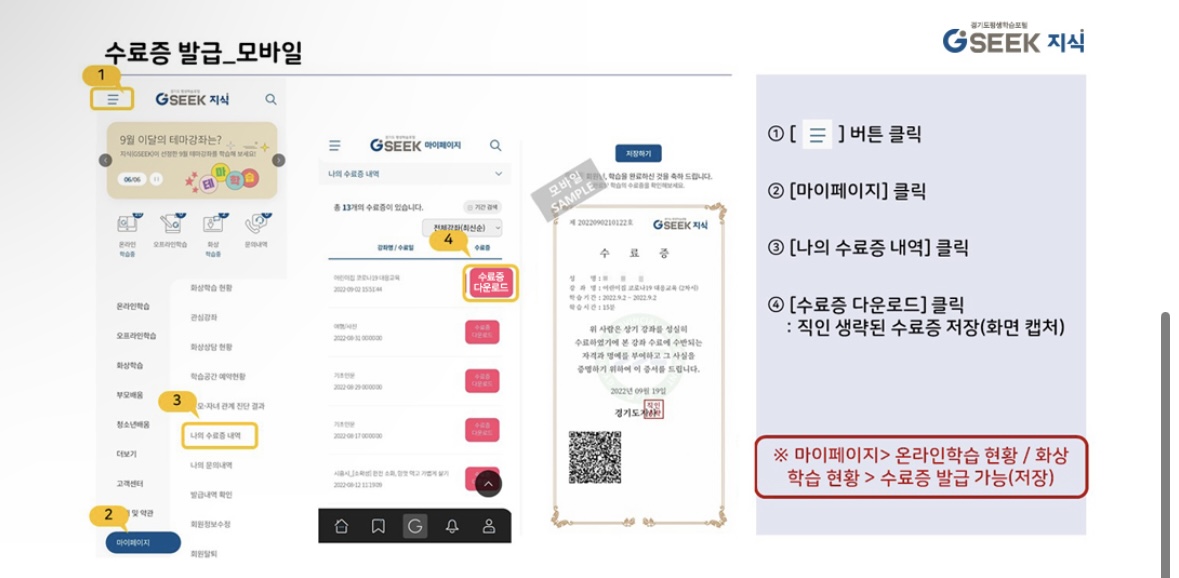 교육이수증 발급 방법은 경기도 평생학습포털 사이트에 들어가면 자세하게 안내가 되어있으니 참고하시면 되겠습니다.