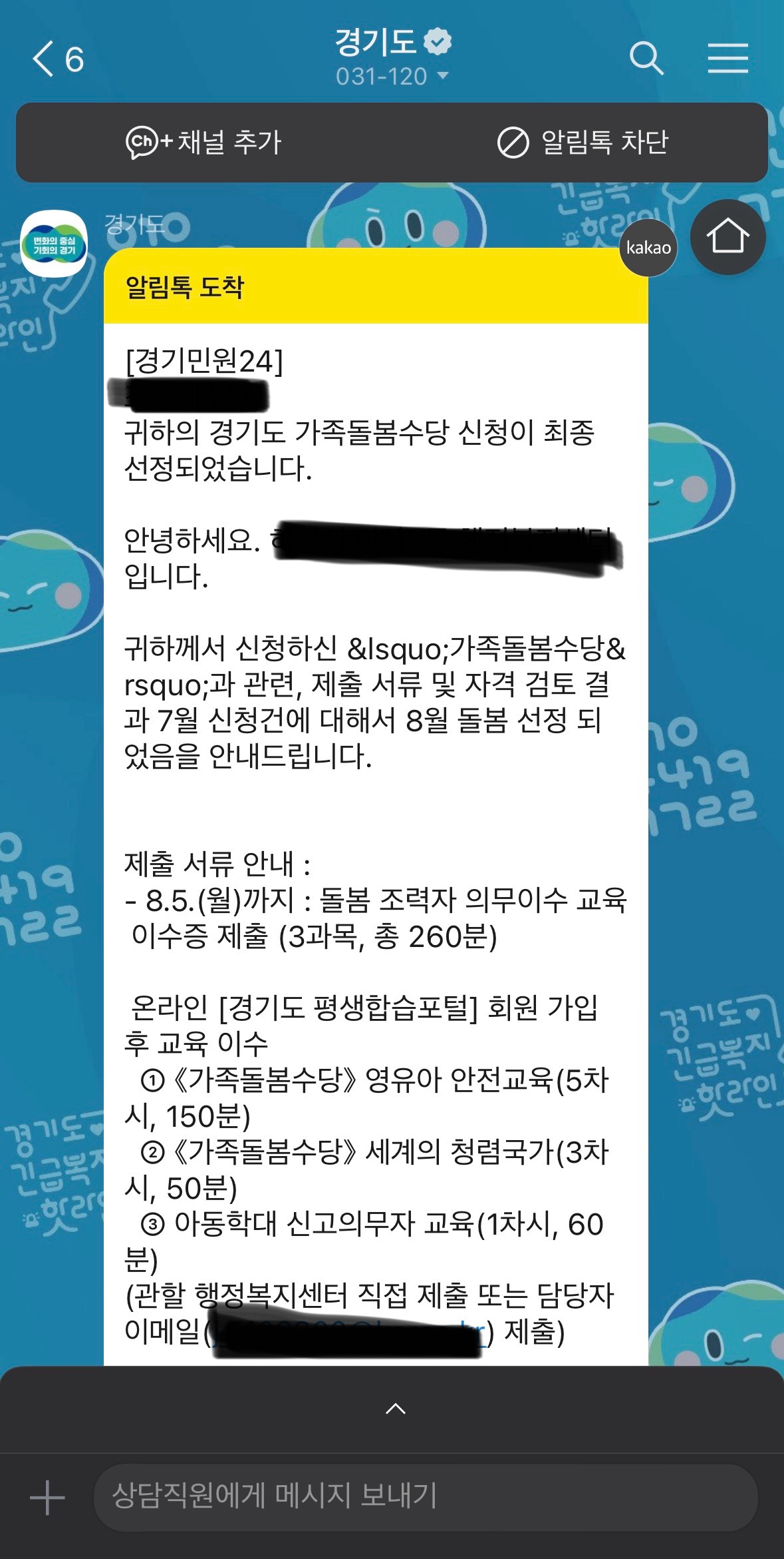 경기도 가족볼돔수당이 선정되면 카카오톡으로 다음과 같이 연락이 옵니다.