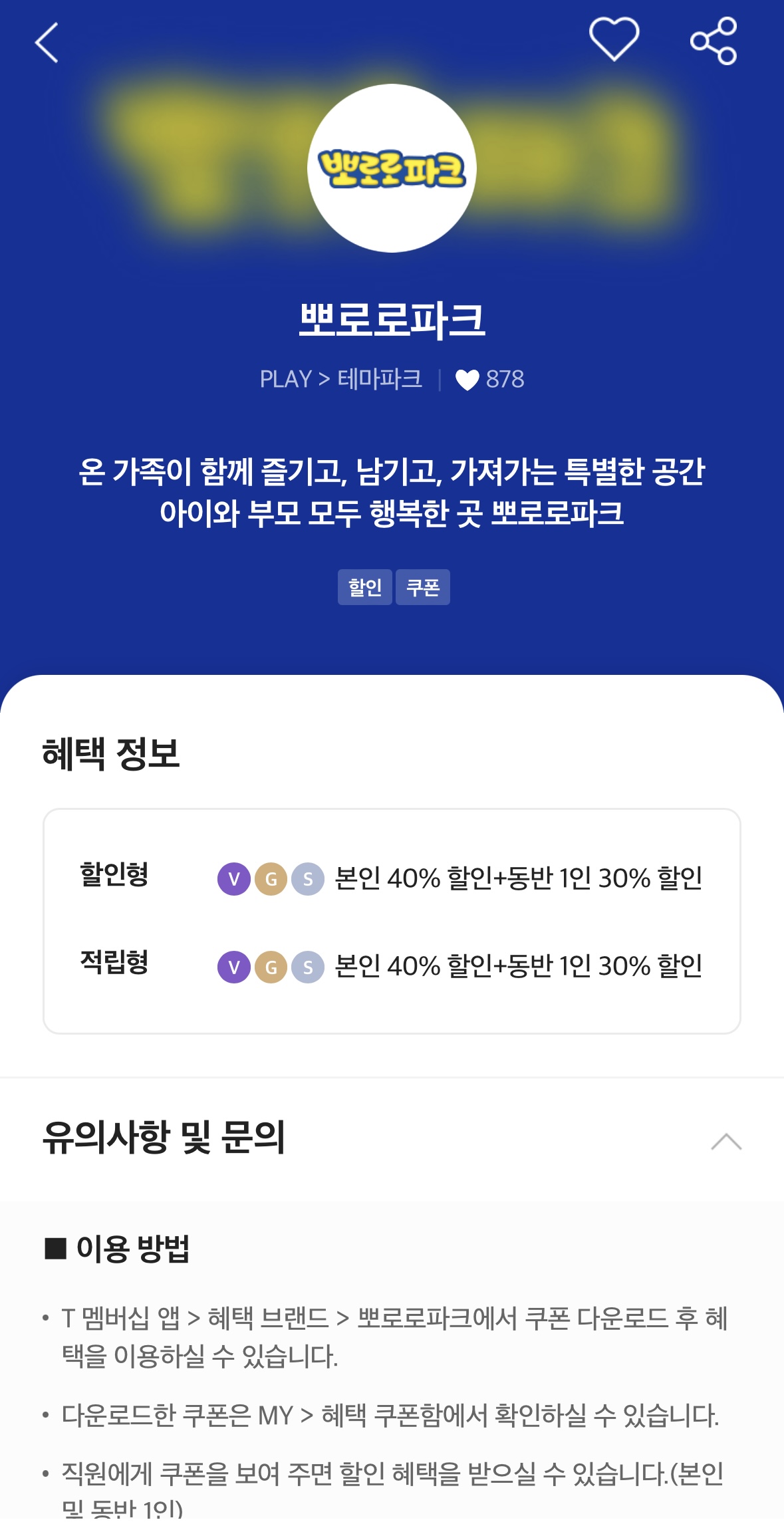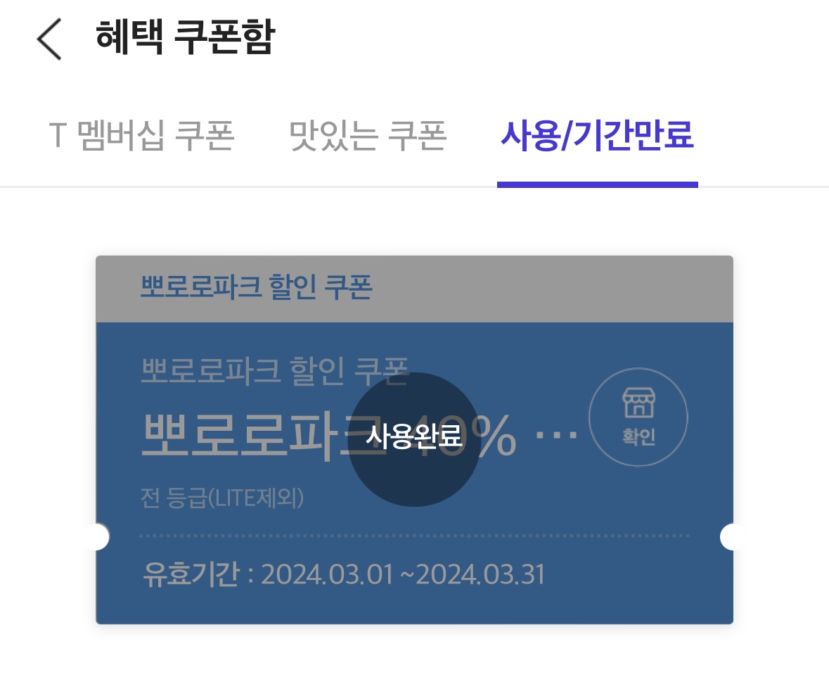 그럼 위와 같은 내용의 화면이 나타납니다. 사진에서도 보이듯 아직도 t멤버십에서는 뽀로로 테마파크 40퍼센트 할인 이벤트를 진행하고 있습니다.