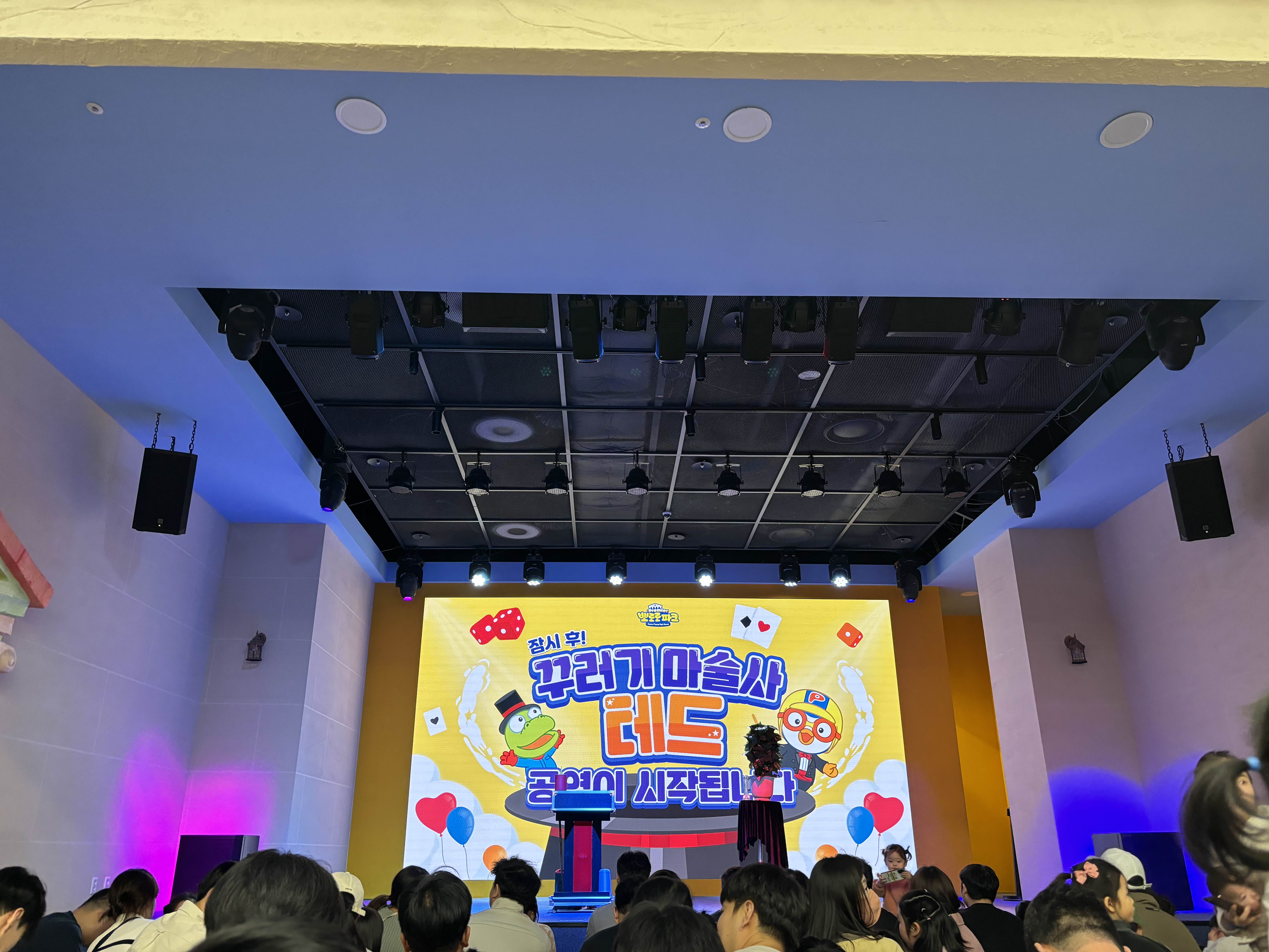 뽀로로 테마파크에 들어오면 이렇게 작은 홀이 있습니다. 작은 홀에서 여러가지 이벤트를 많이 합니다. 저희도 들어오자마자 마술쇼를 해서 봤습니다. 아이들 맞춤형이라 엄청 신기하고 그렇진 않습니다. 초등학생 정도 되보이는 아이들은 시시해합니다. 저희 딸도 조금 보다가 지나갔네요.
