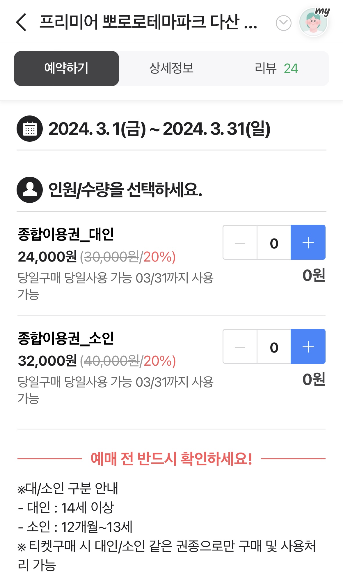 가격표를 보면 대인은 24,000원이고 소인은 32,000원이라고 나옵니다.