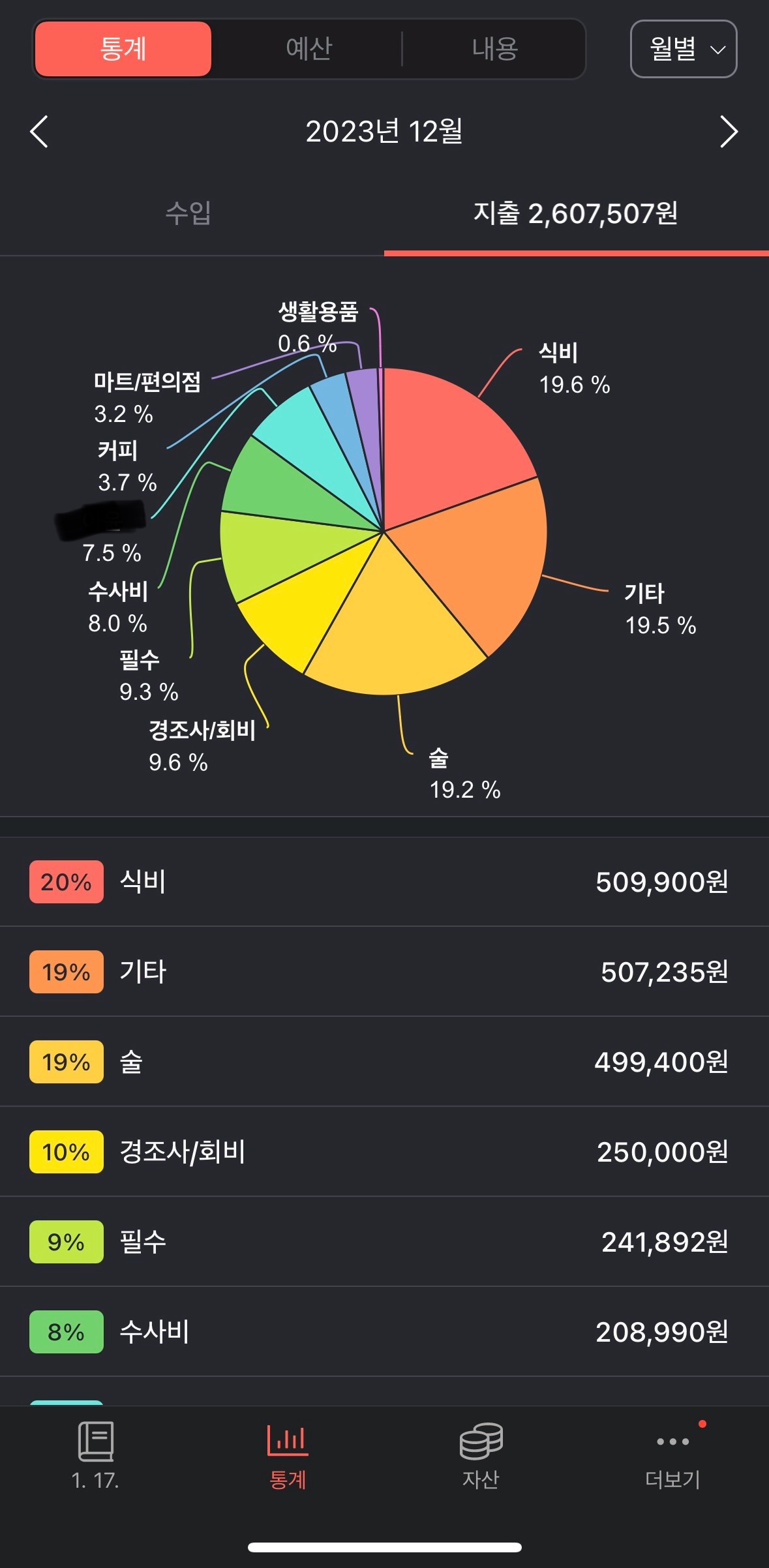 분류와 자산란을 명학히 작성하면 통계분석에서 나의 소비습관이 명확히 확인됩니다.