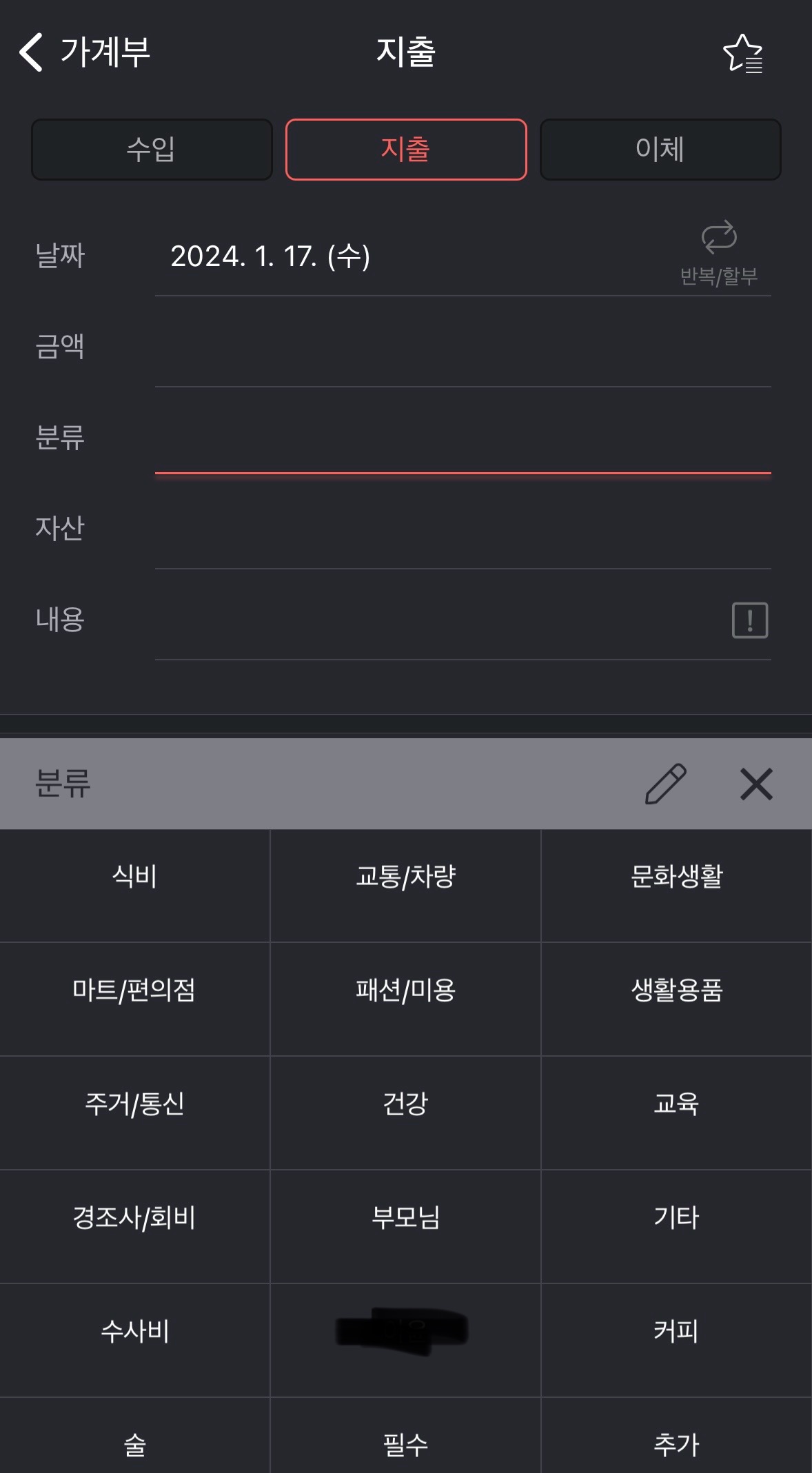 분류에는 편한가계부 어플에서 이미 만들어 놓은 목록이 있고, 사용자가 목록을 추가로 생성할 수 있습니다.