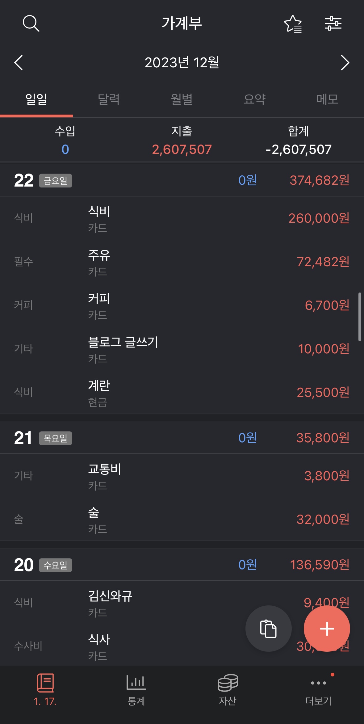 하지만 한 눈에 잘 들어오고 날짜별로 소비 형태를 분석하기 좋습니다.