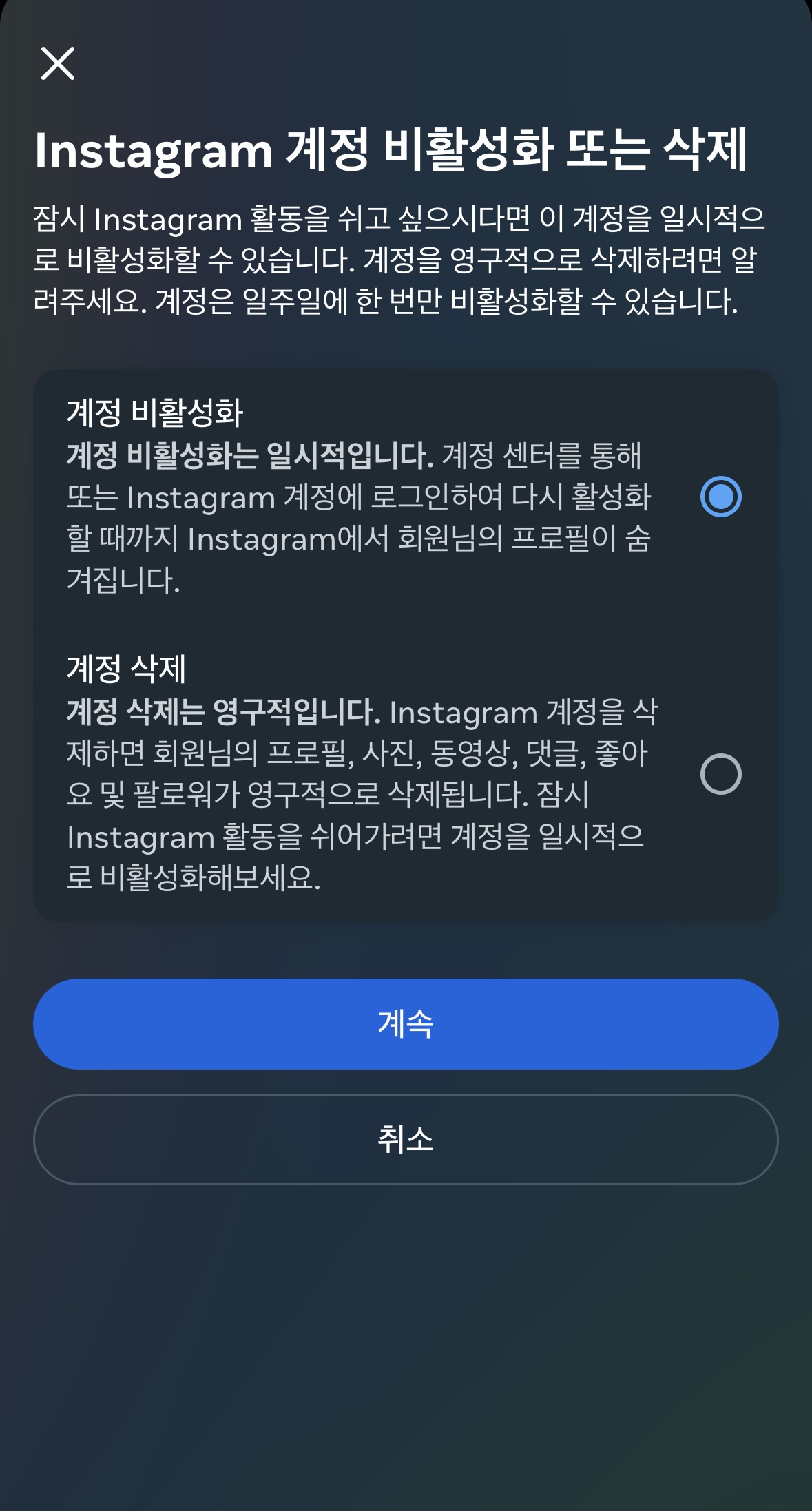 계정 비활성화는 말 그대로 일시적으로 잠시 계정을 중단하는 것이기 때문에 계정이 삭제되는 것은 아닙니다.